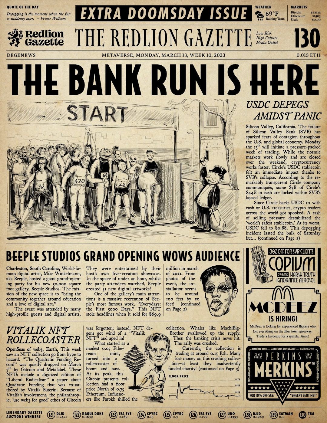 At the time of making the concept, the market looked like it was doomsday. So we went with a doomsday issue of an old newspaper, featuring different articles about the various events that took place in the past week. The headline was of course the bank run that had been initiated following the uncertainty in the market. We decided to show several of our favorite crypto characters like Pepe, Wojak, Beard Guy and so on ready for the marathon-bank- run. The marksman was the villain from monopoly firing away the starting signal.