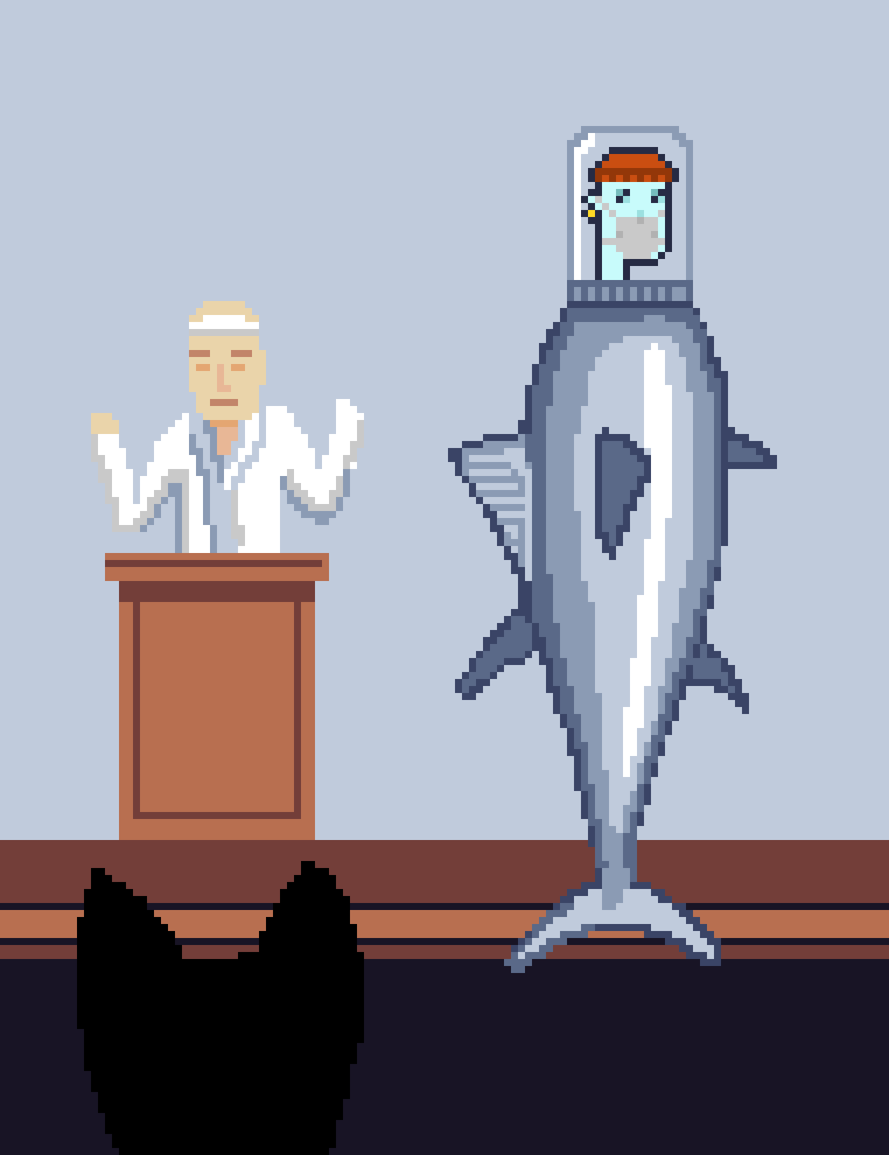 The Covid Alien Punk head in the jar mounted on the tuna body. Is it “Silly” enough? Credit goes to Red for figuring out this glowing reference to Japanese tuna auctions.