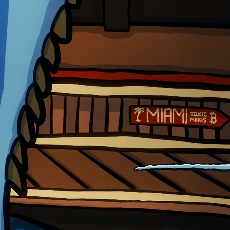 A tiny easter egg in the bottom right corner references the Miami Bitcoin conference full of rampaging Bitcoin maximalists. Besides the direction sign, you can also follow the strange white trail that Max Kaiser left behind...