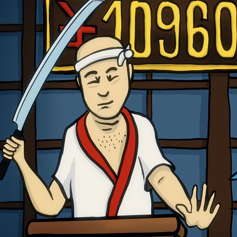 The auctioneer in our story is a skilled sushi chef holding Maguro Kiri - a tuna cutting knife - instead of a gavel. The bid shown on the price board behind him is in Yen currency equivalent to keep the theme consistent.