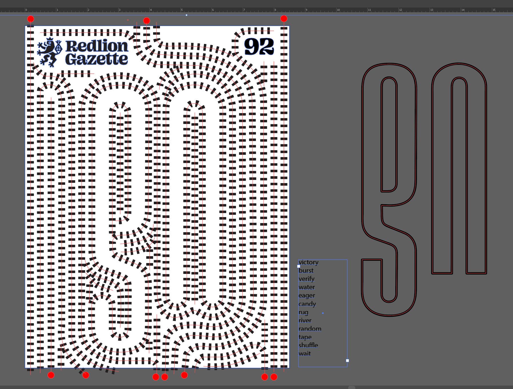 Then I chose a very condensed font to lay out gn letters first and draw the paths around it - in a more intuitive way than scientifically calculated, simply eyeballing the lengths of each line to be more or less similar. The red dots in the image are signaling the starting point of each line.