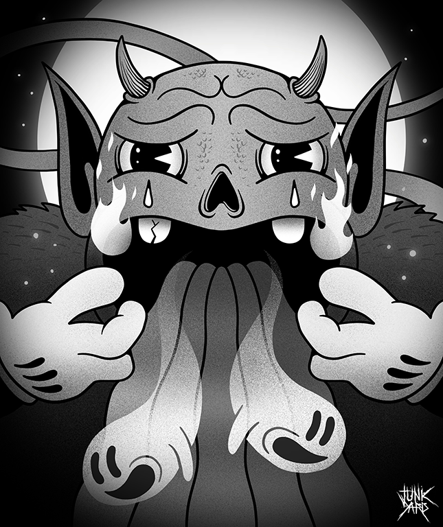 Junkyard is a professional artist known for using his gritty and rubber hose cartoon style artwork to evoke discomfort. His anxiety-inducing exploration of controversial and dark subjects is often juxtaposed with smiling characters.