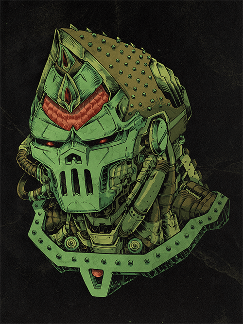 The fifth week of The Inevitable brings us Cyberdoom Funeral Mask by Killer Napkins. Much like King Tut’s golden funeral mask, Cyberdoom Funeral Mask is worn to this last gala, ensuring the safe passage of a cyborg’s soul to the After.