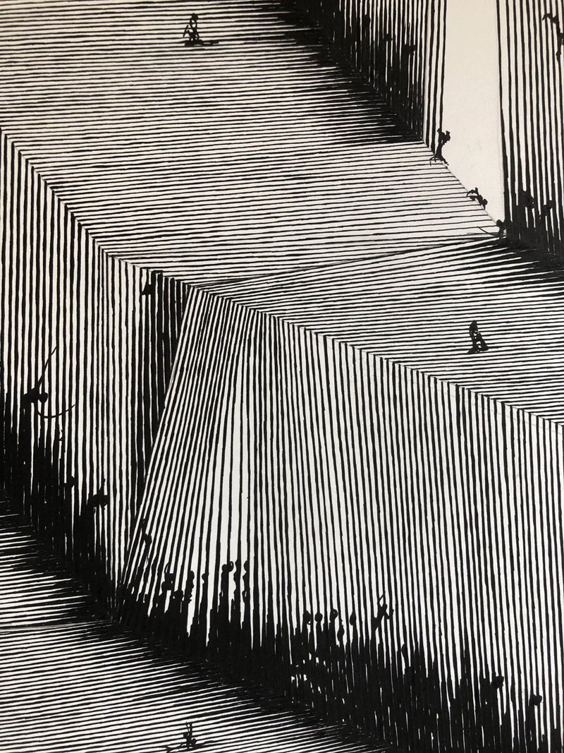 I outline an idea I have in pencil, then I fill it in with a lot of Ink and a lot of lines, then later I elaborate the forms