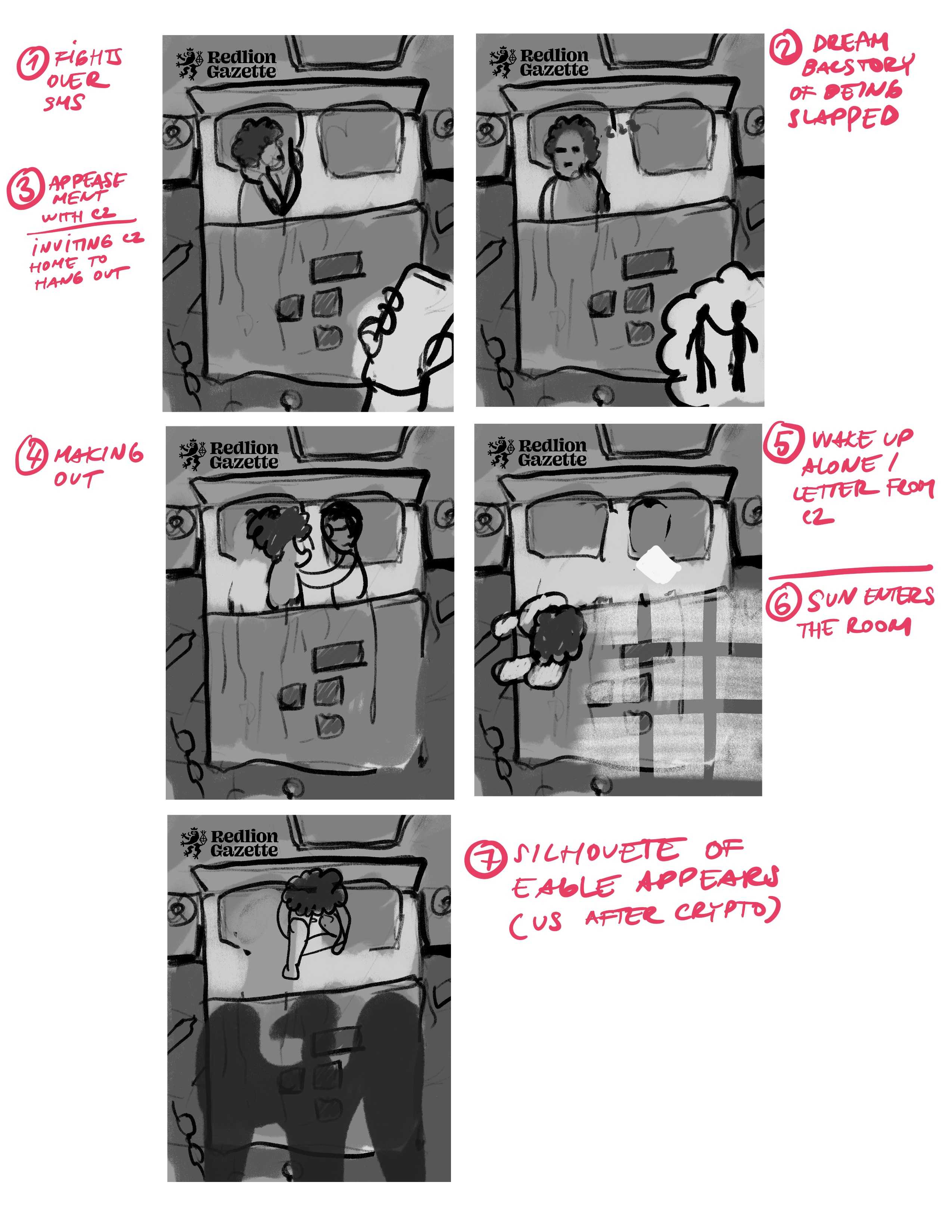 We took to the board room with events continuing to unfurl as we were mapping out a concept. We decided we would feature the bedroom of Sam Bankman-Fried as pictured during the various stages of the fallout. Starting with an orgy scene that involves his “core” team members from FTX; second, we see Sam starting to beef with CZ over the liquidity issue; third, Sam falls asleep while his phone continues to receive messages from CZ who has decided to come over and talk it out; the fourth scene is of CZ and Sam in a heated probing session; fifth, we have Sam who wakes up to find CZ has ghosted him leaving a text and finally we see that Sam has packed and is ready to leave for the Bahamas.