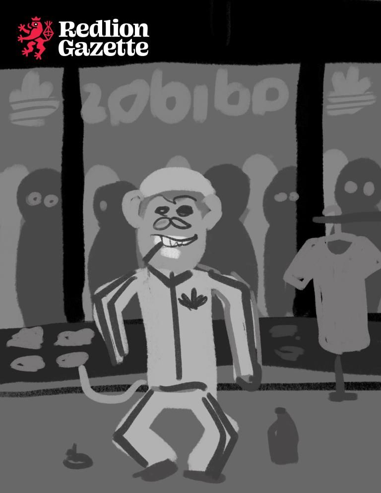 We threw a couple of ideas on board to stir up a plan. That’s when Red suggested using a gopnik ape. For those who are not familiar with gopniks, a gopnik in Russian, and in Russia, is now a drunken hooligan, small-time lout, and criminal. We engrained the ape into the gopnik and placed him inside an Adidas store. Outside we have people illustrated in the iconic style rioting against the lousy drop by Adidas. On the top corner, you can find a small message that went viral after a degen contacted Adidas support.Â