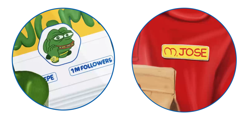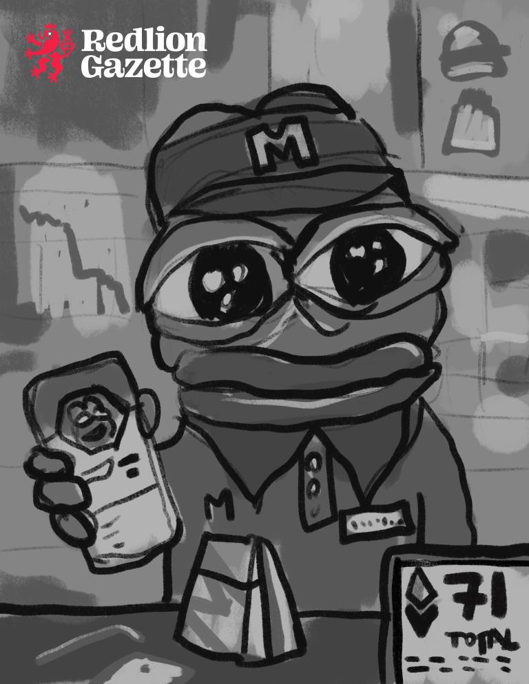 The cover was wavering between several dull concepts before Dudly came up with this brilliant one at 2 AM Sat. Our meme star reminiscing the good old days spent as a millionaire in crypto while he works the counter at a fast-food outlet you all are familiar with. Immediately after the sketch was brought onto the table we could not help find the witty situation depicted. Plus we had the meme-star taking center stage! Due to how furie-ous the creator of Pepe can get we stayed away from using the real name. Instead, we have it Jose here. It’s common for Joses to have the nickname Pepe. We set out to paint the artwork in a jiffy after choosing between two versions of our star.Â