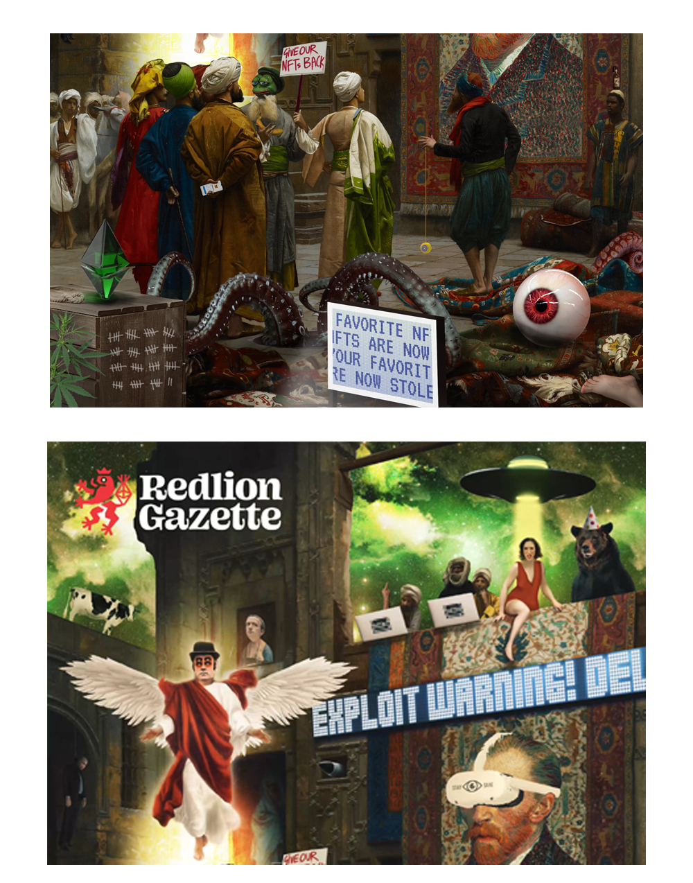We made it a point to include classic Alotta elements like the eye, tentacles, a cow, and a UFO trying to abduct Randi. The protest is led by none other than a deeply disappointed Jose on how NFTs have recently been subject to a lot of questionable events. Also, can you spot how we have encrypted the issue number? Brownie points if you did!